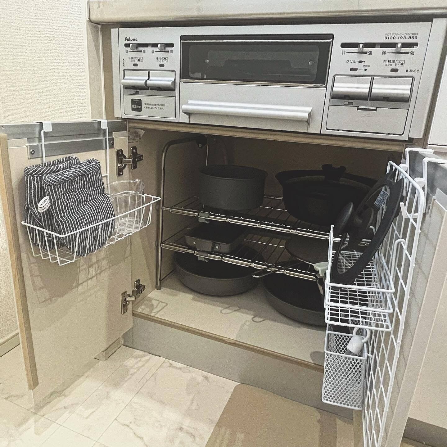 ニトリと100均で統一しているという、シンク下の収納アイデアです!お鍋はラックに並べて取り出しもしやすい収納に!さらに扉裏スペースも有効活用すれば、このようにキッチン関連アイテムをまとめて美しく収納できそうです。