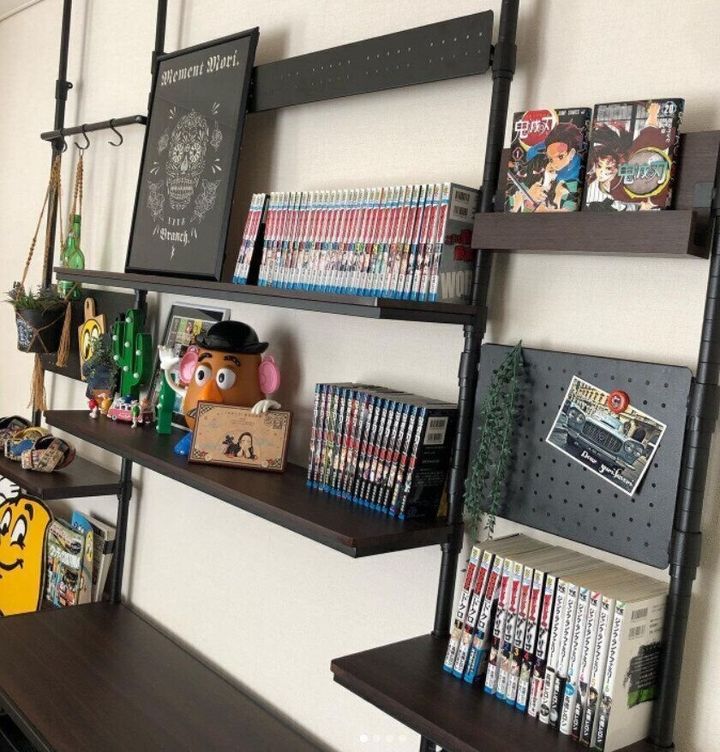 漫画コレクションをまとめて壁面収納に!このように、漫画に合わせて小物やオブジェでカラーリングを統一すると、インテリアとしてもおしゃれに映えます。取り出しもしやすく、漫画を選ぶのが楽しくなりそうな素敵な収納アイデアです!気分に合わせてディスプレイを変えられるのも素敵ですね。