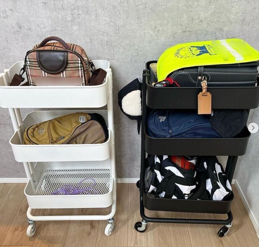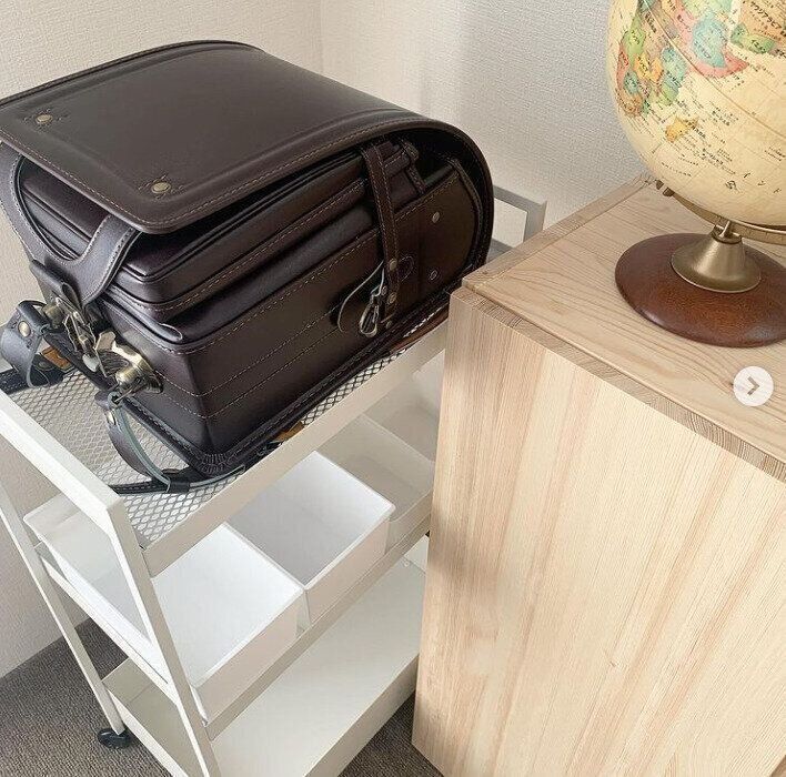 角ばったデザインとカラーリングもおしゃれなIKEAのワゴン、ニッサフォース。キャスターつきで自由に移動でき、上段にランドセル、中段に身支度セット、下段に学用品諸々というように、必要な物をまとめて収納できるのがうれしいポイントです!お部屋のインテリアとのなじみもよく、真似したくなる素敵なアイデアです!