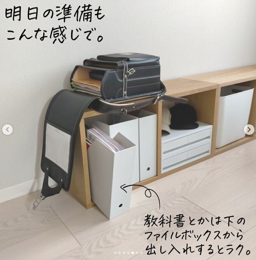 こちらは、無印良品のスタッキングシェルフを横向きにした収納アイデアです!特に小学校低学年のお子さまは、重たいランドセルを置くのも一苦労。これならランドセルを背負うのも、おろすのもラクになりそうです!教科書などをファイルボックスに収納しておけば、そのまま準備もできて便利です。