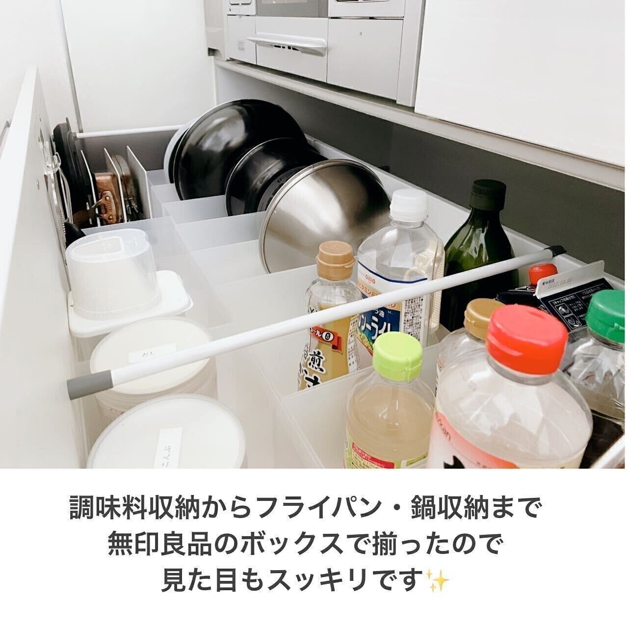 無印良品のファイルボックスを活用した、素敵な収納アイデアです。ボックス収納で統一することで、見た目も美しく、余裕のある収納スペースに!取り出しもしやすそうです。大きめのお鍋やボウルもすっぽり入るサイズ感が◎。種類やサイズも豊富なので、お気に入りを探してみてくださいね。