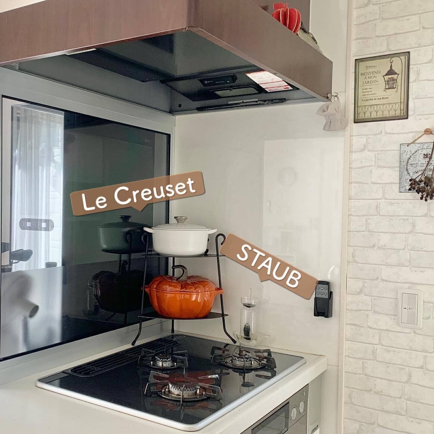 使用頻度の高いお気に入りのお鍋は、コンロ横に置いて「魅せる収納」に!料理中の気分も高めてくれそうな、素敵な収納アイデアです。このようにおしゃれなスタンドを活用すれば、出し入れしやすく、お手入れの頻度もアップしそうです。キッチンのインテリアのひとつとして取り入れるのもよいですね。
