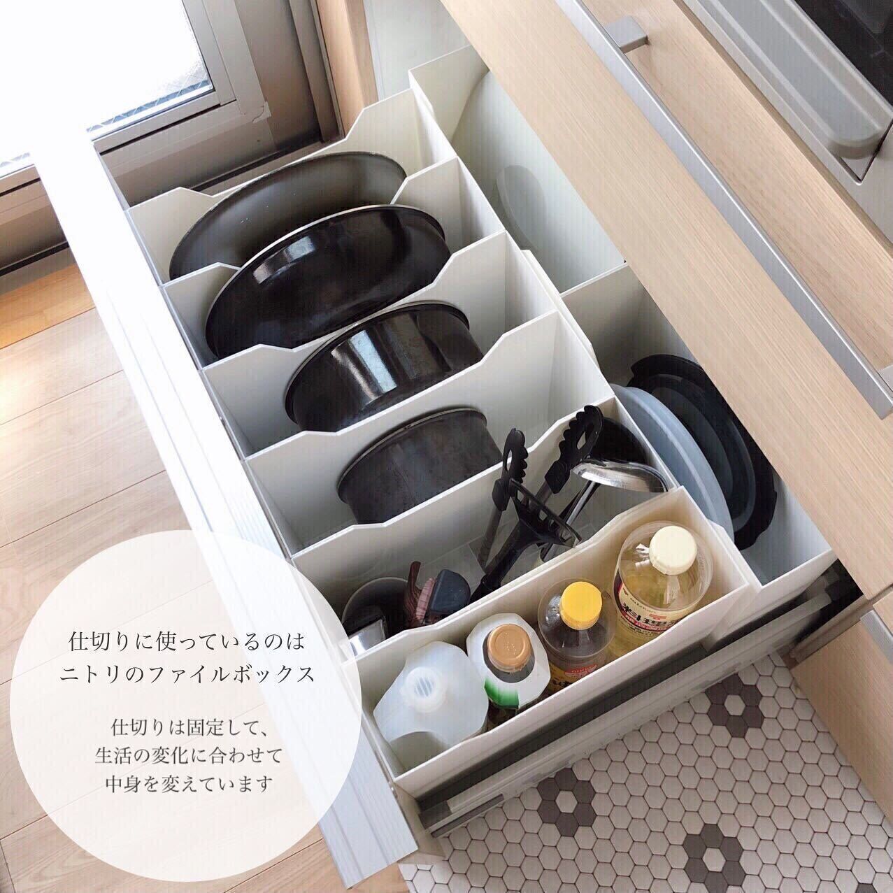 ニトリのファイルボックスを活用した、コンロ下の収納アイデアです!サイズに統一感があるので、よりスッキリとした印象に。鍋やフライパンなどと一緒に、よく使うものを近くに収納すると家事もラクになりそうです。おうちの収納スペースにぴったりハマるような、統一感のある調理器具を揃えるのもおすすめです。