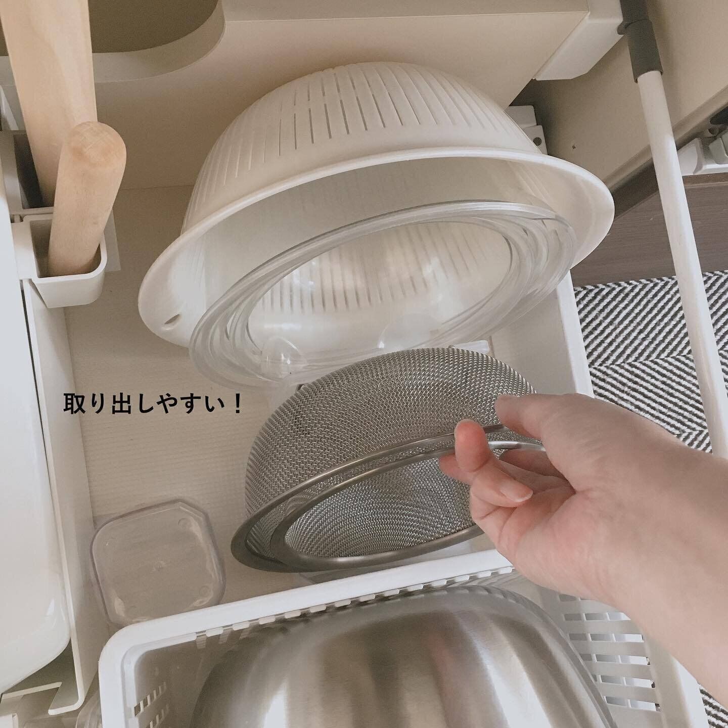 衣類やタオルなどを、倒れず綺麗に収納できるセリアの「引き出し用仕切り」。こちらは「引き出し用仕切り」を2つ連結させた素敵な収納アイデアです!このように連結させて使えば、ざるやボウル、鍋も取り出しやすく、仕切りながら使えるのがうれしいところ。収納スペースも綺麗に保ちやすくなりそうです。