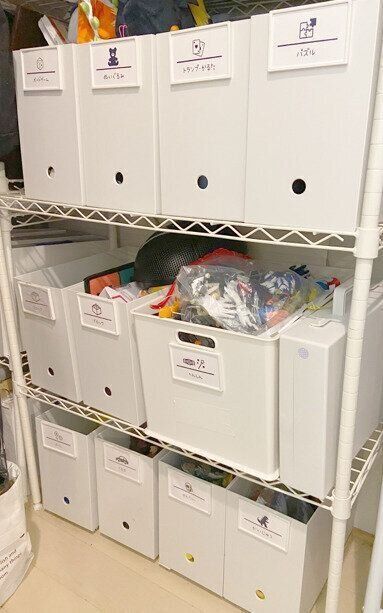 おもちゃ収納が出来ている方はカテゴリごとに、お子さん自身に『好きなおもちゃ、使うおもちゃ』を収納に入れていって貰います。