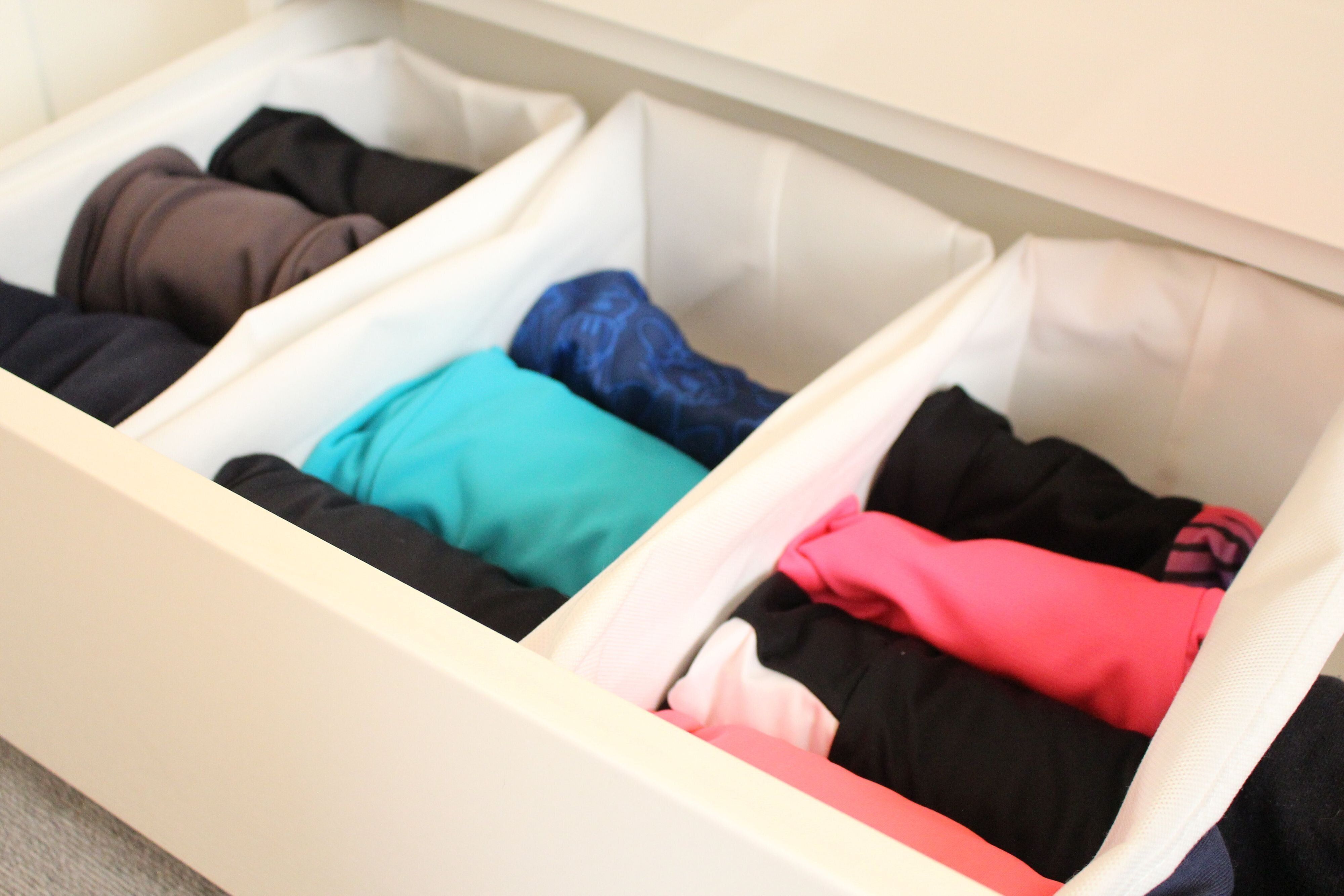 今回は、3人の子どもたちのスポーツウェアを3つの仕切りケースに分けて収納しました。