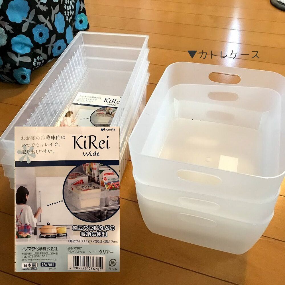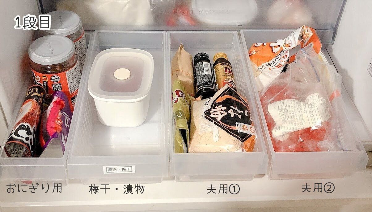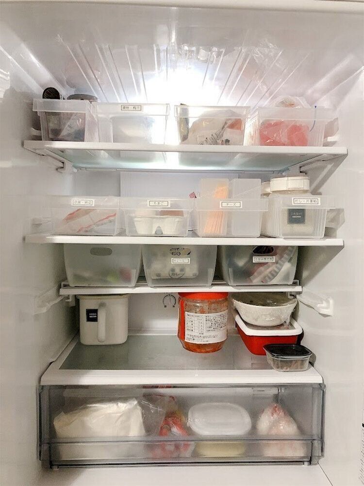 冷蔵庫収納には、あえて中身が見える半透明のケースを使っています。