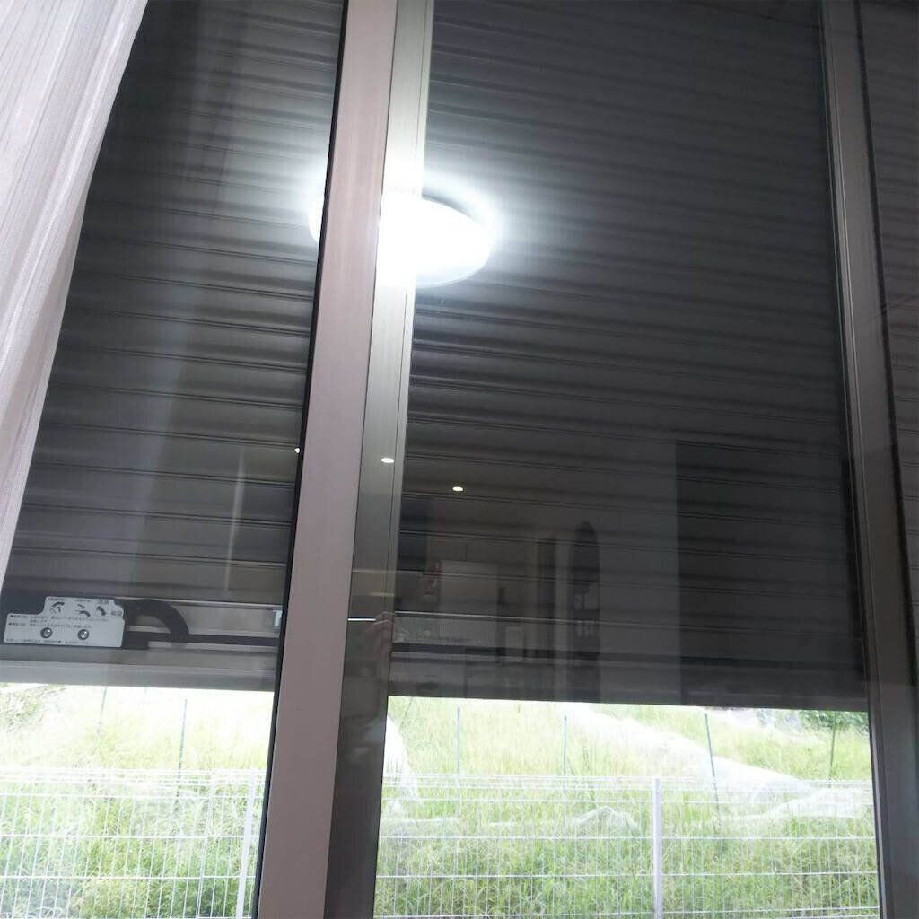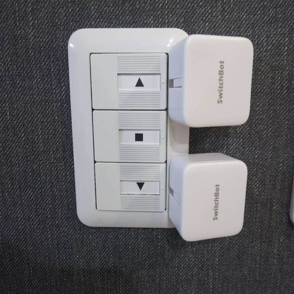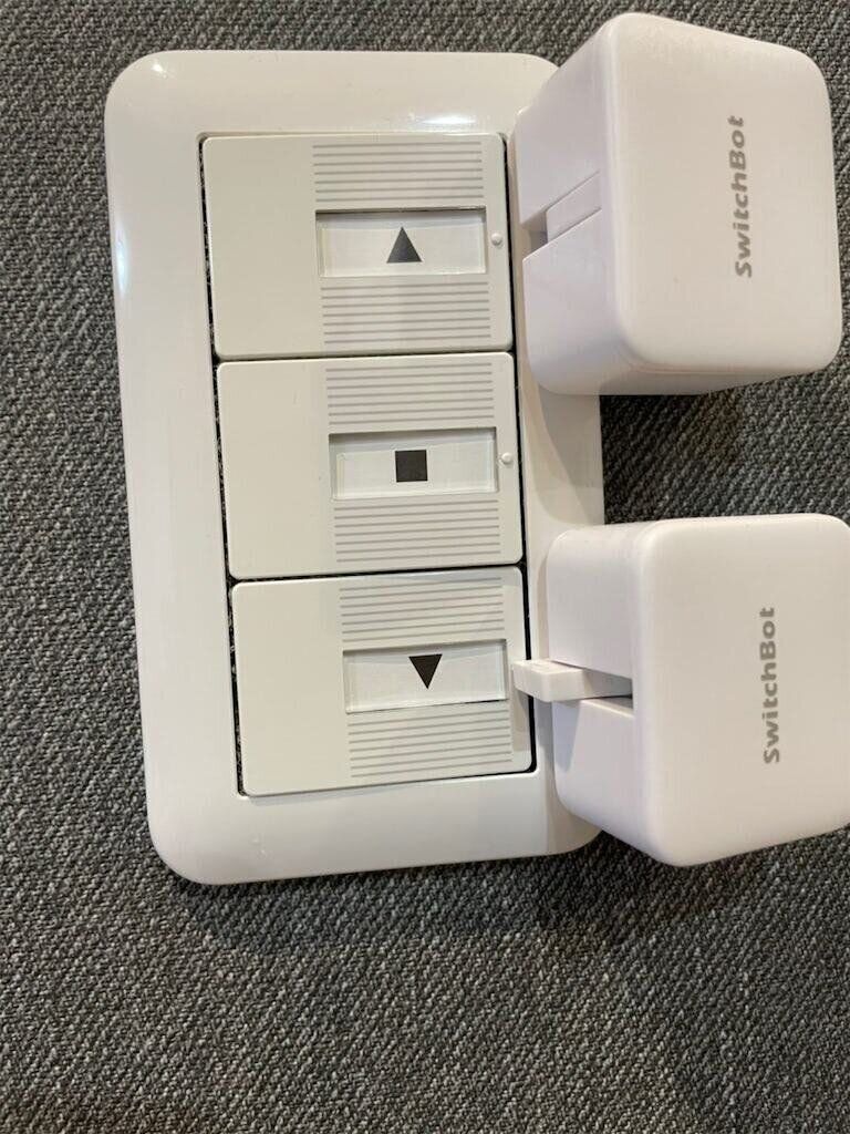 1. スイッチボットを取り付けたいスイッチの横に付属の粘着テープでくっつけます。今回は、リビング窓の電動シャッターのスイッチの「開」「閉」の2つのスイッチ横につけます。