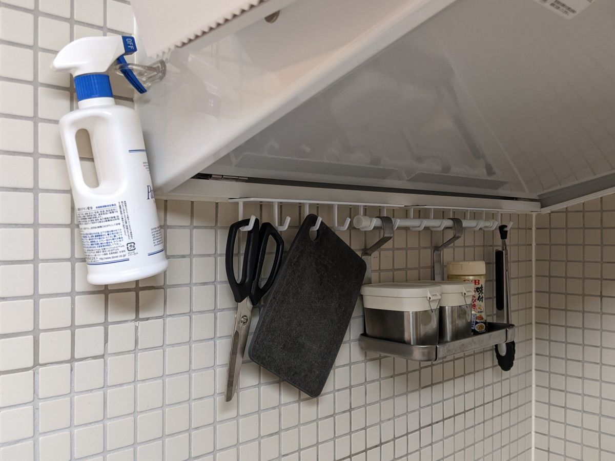 セリアの「何度でも貼ってはがせる フィルムリングフック」をレンジフード側面につけ、アルコールスプレーを掛けています。