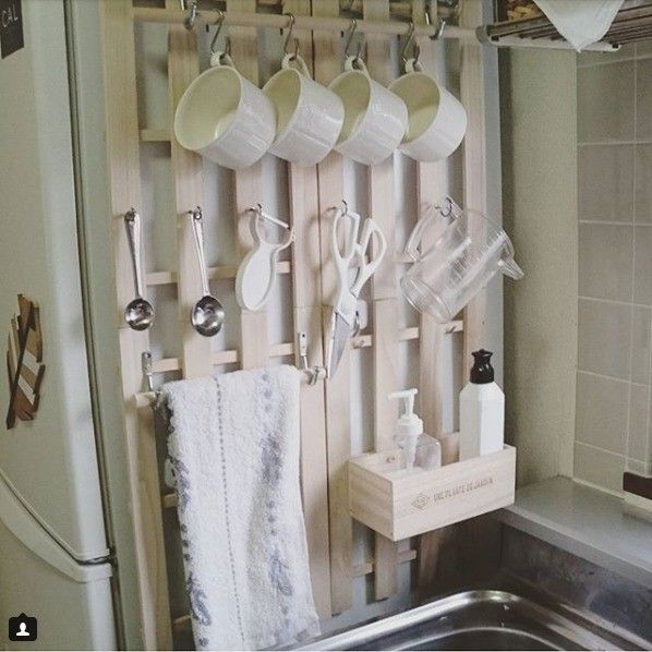 インスタグラマーのrk.07.07さんは冷蔵庫の横にすのこを置き、そこにフックを取り付けてさまざまなキッチンツールを吊るして収納。フックに棒を引っかけることで、さらに収納力をアップしているのがスゴイ!