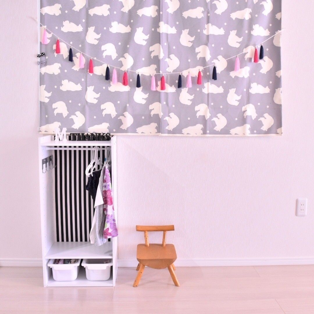 サンキュ!ブロガー森さや香さん背面に大好きなモノトーンの布を貼り、帽子やカバンを引っ掛ける金具、突っ張り棒をセット。これだけで幼稚園グッズを収納できる空間に早変わりです。大好きなモノトーンの布がアクセントになっていますね!