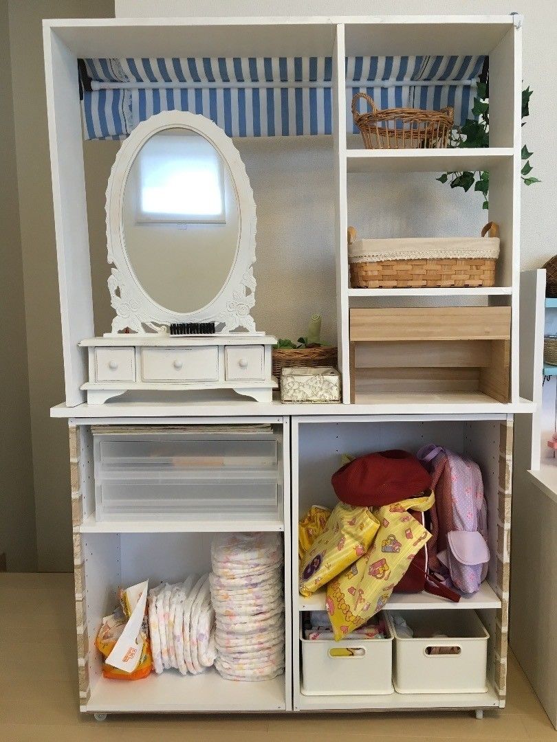 サンキュ!ブロガーここゆきさんが作成したのは、正面はお店屋さんカウンターそして裏はなんと身支度ロッカーという2WAY仕様!足にはキャスターを付けているので子どもでも動かすことができます。扉を付けるか悩んだ結果、保育園と同じオープン収納にすることで、自分でお片付けできる空間に仕上げました。