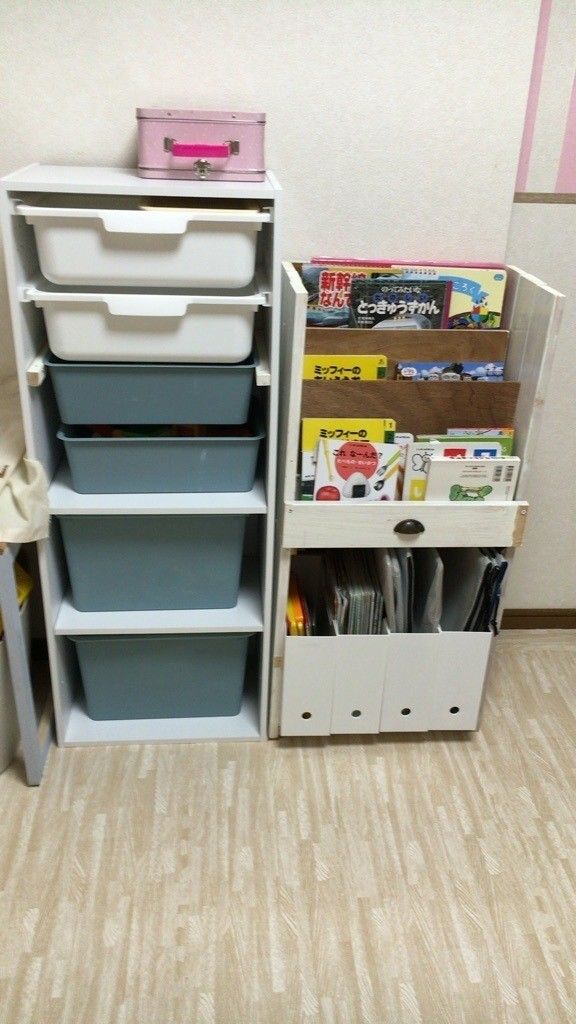 別売りのレールを利用するとボックスがスライド式に早変わりします。サンキュ!ブロガーHitomiさんは、上の白いボックスをニトリ、下のブルーのボックスはダイソーのスクエアケースを活用しIKEAのトロファスト風におもちゃを収納していますよ。