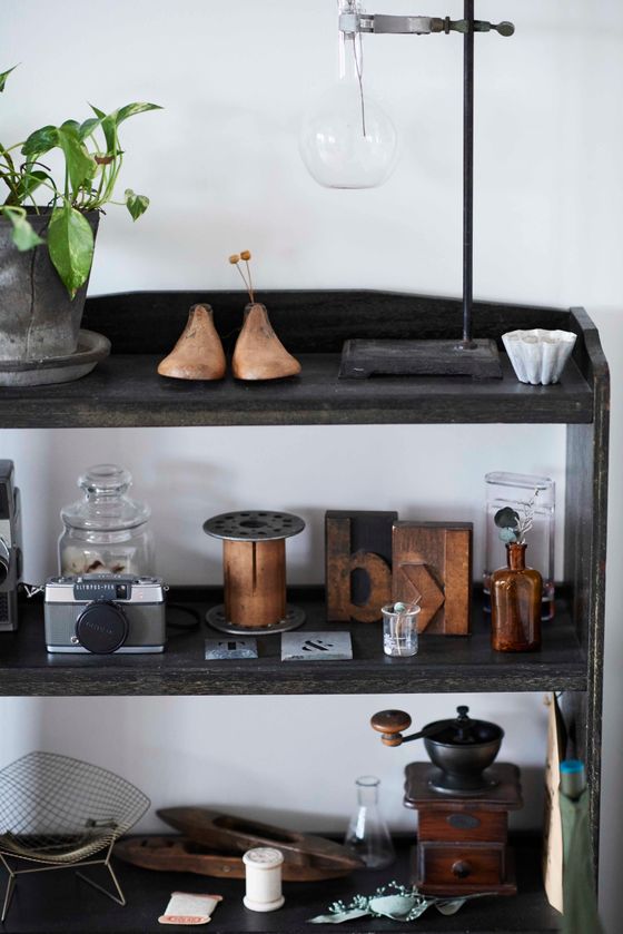 「少しずつ集めたアンティークコレクション。小さな雑貨はバラバラに置くとゴチャついて見えるので、棚にまとめて。雑貨同士が互いに引き立て合い、素敵なコーナーが完成」