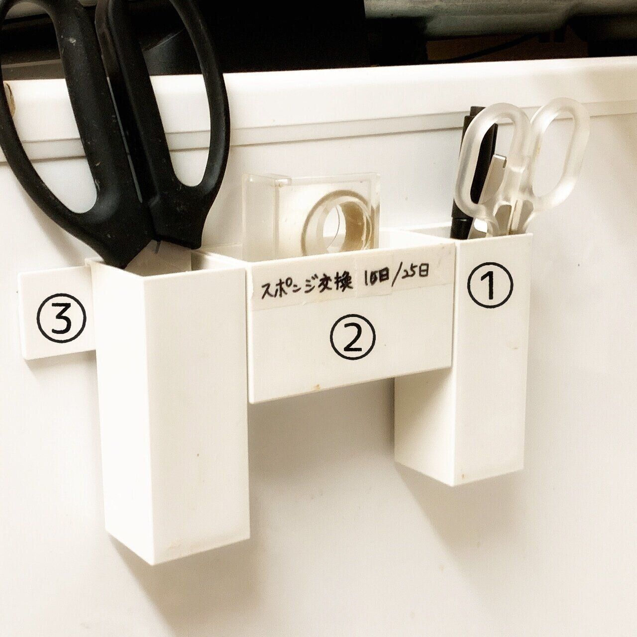 ハサミやメモ代わりに使うマスキングテープを収納しています。