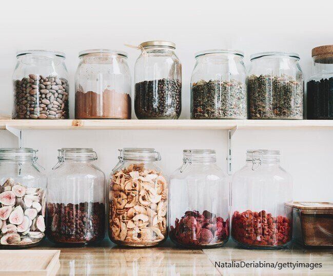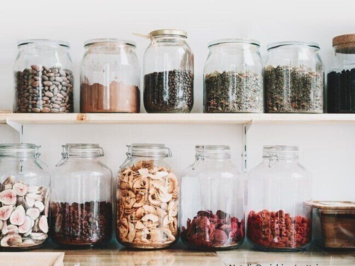 棚に入れる収納用品や保存容器など。並んでいる物の高さがバラバラで凸凹があると、印象がごちゃついて見えます。