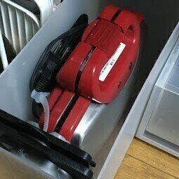 事務用品として定番のファイルボックスはキッチンでも大活躍。シンク下でホットサンドメーカーの収納に使っています。