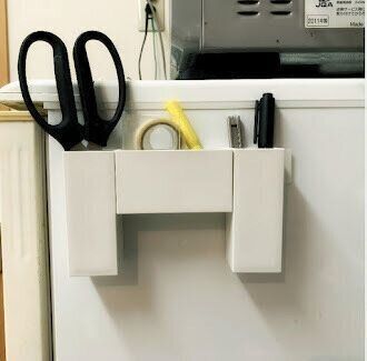 冷蔵庫の壁面に付けて、ハサミやメモ代わりに使うマスキングテープを収納しています。