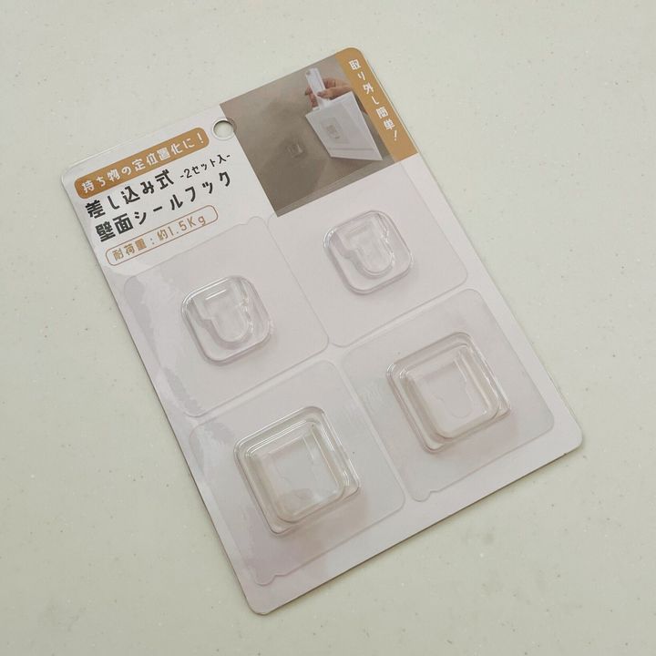 こちらのフックは2組入りで110円と、1組55円で空中収納することができるコスパ最強フック!わが家はティッシュを浮かせて定位置化しましたが、他にもゴミ箱を浮かせたりトイレブラシをケースごと浮かせると掃除も楽になりそうです。