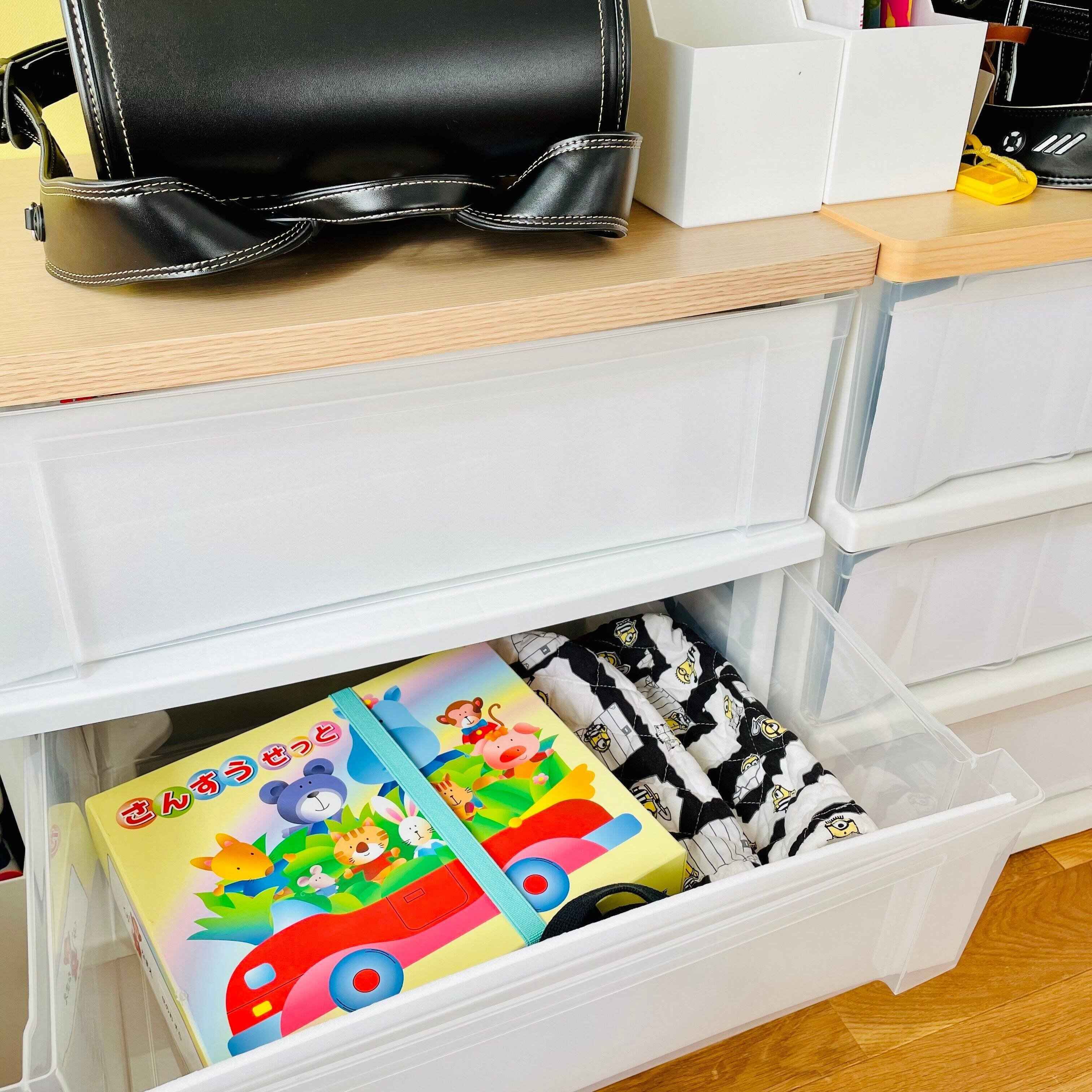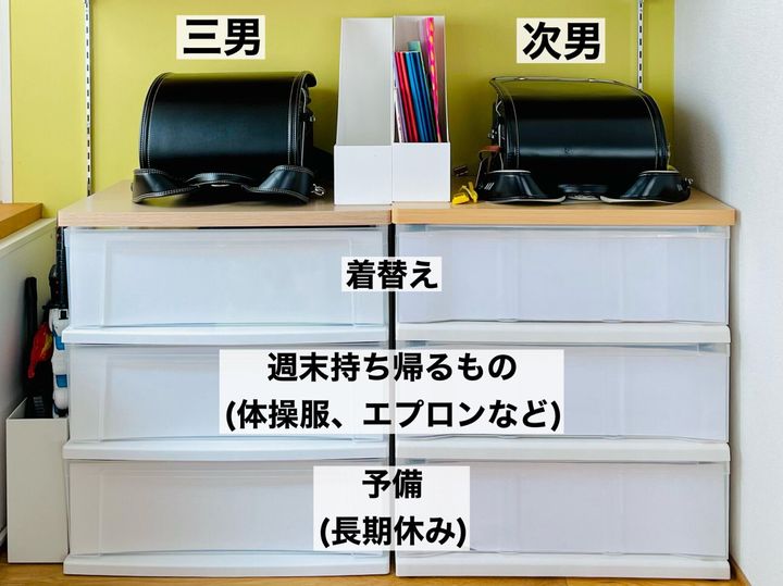 引き出しの1番上は着替え、下2段は学用品のスペースです。