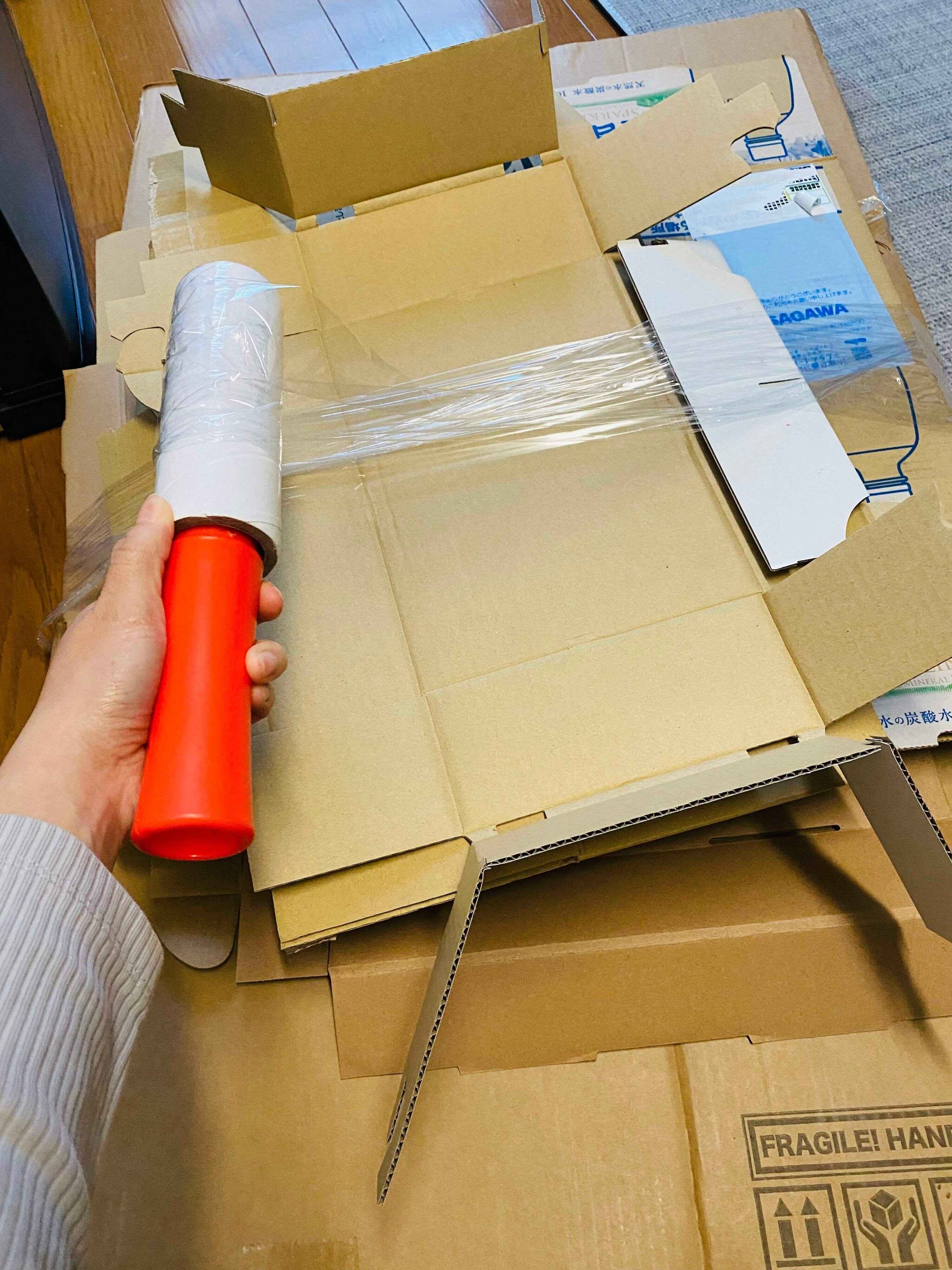 これまで段ボールなどをまとめる時には梱包用の紐を使っていましたが、不器用なのでしばった後に解けてきたりする事もあり、それがストレスになっていました。こちらはハンディタイプなのでラップのようにくるくる巻き付けるだけでピッタリ密着し、巻いた後は解けない!