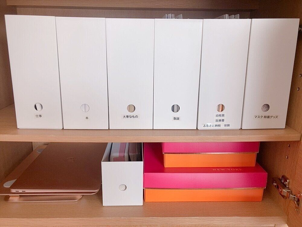 家電の保証書や仕事関係、子どもの学校関係の書類などやはり紙としてとっておかなければいけないものもあります。これらのものはファイルボックスにカテゴリーごとにまとめて保管しています。