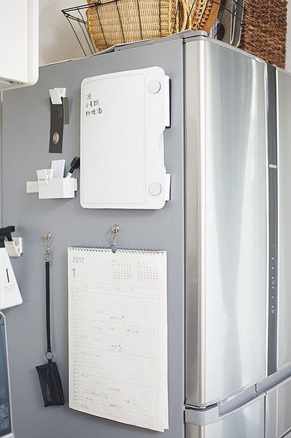 ダイニングからは見えにくいけど、ママがいちばん目にする“冷蔵庫の横”は暮らしを整えるための聖地。暮らし管理アイテムを貼りつければ、手帳を出し入れしなくても、頭の中も予定も整理できます。