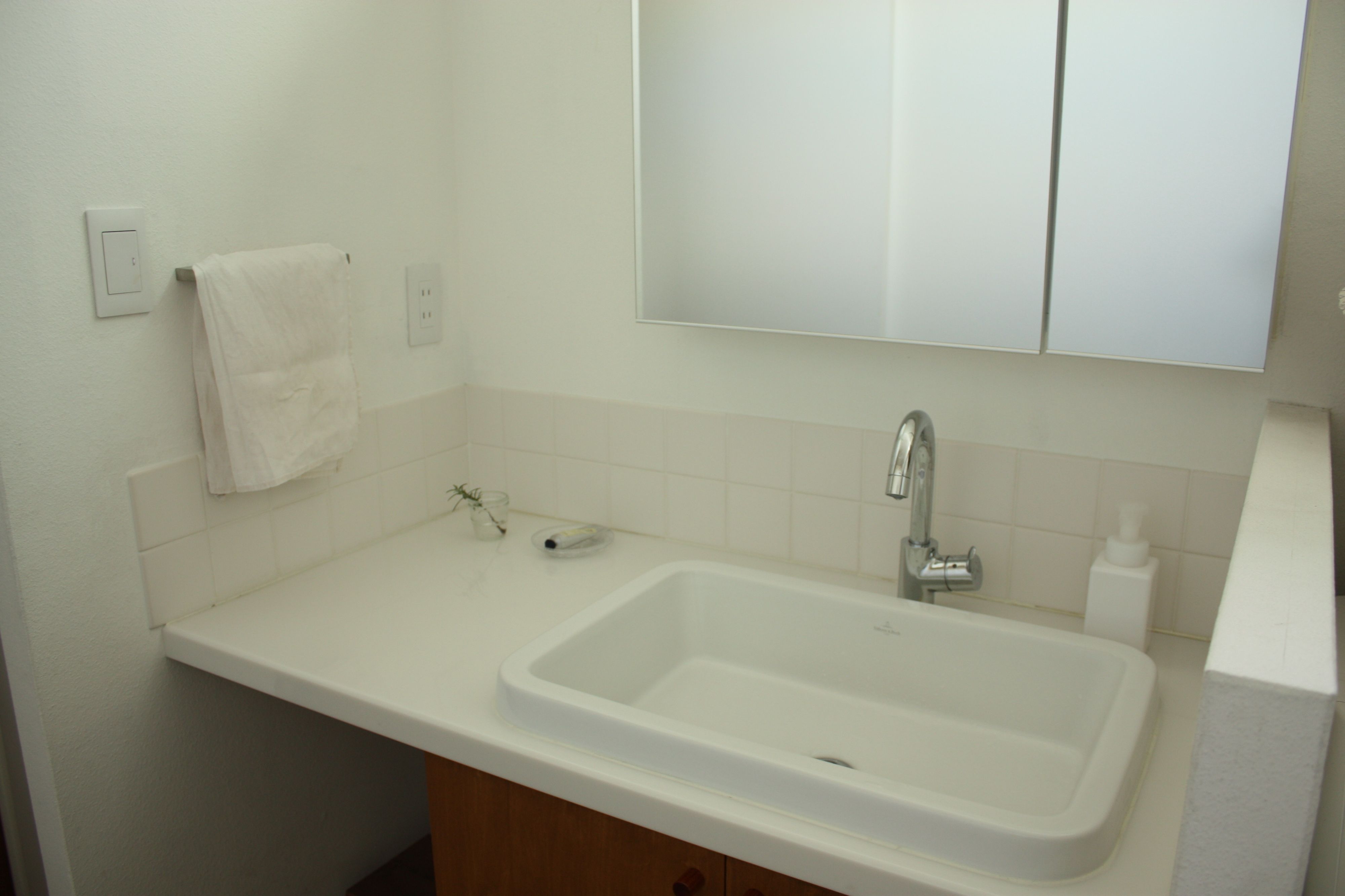 歯ブラシや化粧品をはじめ、家族が身だしなみを整えるグッズが盛りだくさんの洗面所。ミニマリストたちの収納方法やいかに! また、普段の掃除方法についても教えてもらいました。