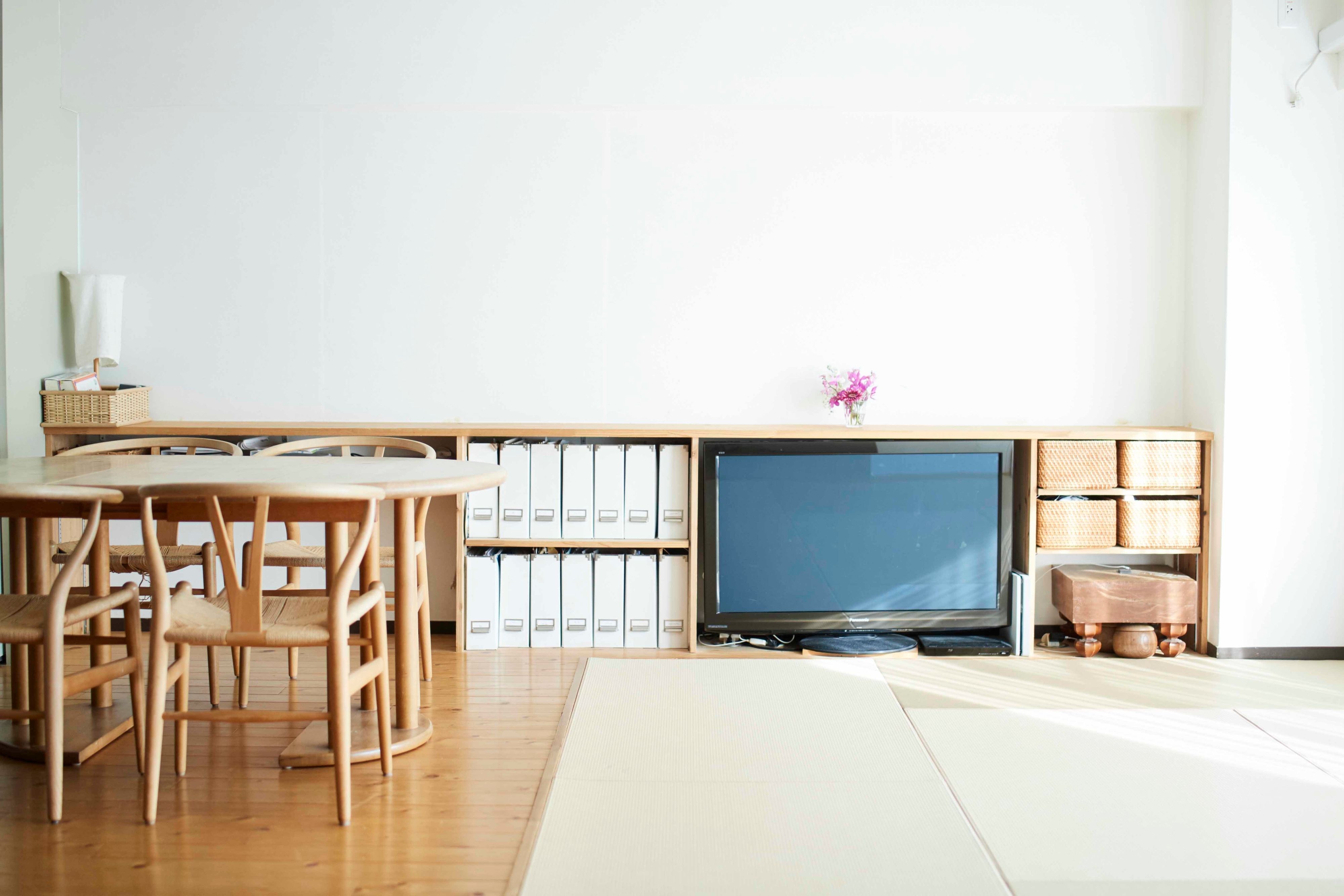 収納アイテムを買うときは、本当に必要かを考えましょう。場所を取るので、むやみに買えば余計に散らかってしまう場合も……。おすすめなのは、「出しておいてもインテリアになじんで絵になるもの」、「使用しないときにたたんでしまえるもの」。写真のものはいずれも無印良品のものです。