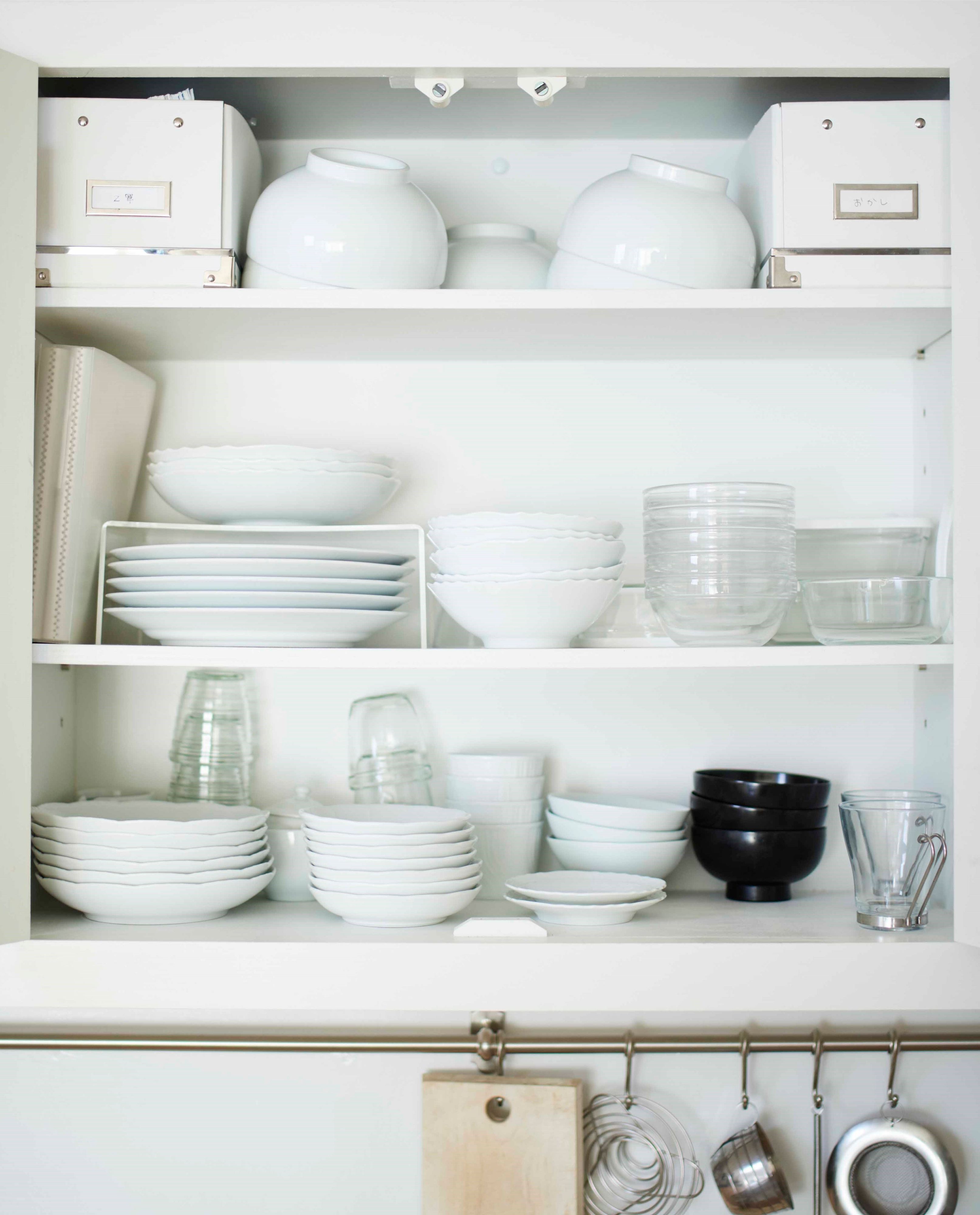 よく使う物(1軍)とたまに使う物(2軍)の収納を分けると、出し入れの時間や手間が大幅短縮できます。棚収納の場合、1軍はさっと手が届く位置に(写真の場合は下段)。2軍は多少取りにくい位置でも問題なし(写真の場合は上段)! 引き出しも1軍を手前に置くとスムーズになります。出し入れに1秒かかるのと、10秒かかるのとでは大違いですよ!