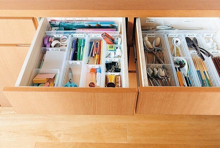 子どもが勉強するときに使う文房具や鉛筆削りは、椅子のすぐ後ろの棚に収納。引き出しの中はセリアのキッチントレーで見やすく仕切り、必要な物を迷わず取り出せるようにしています。