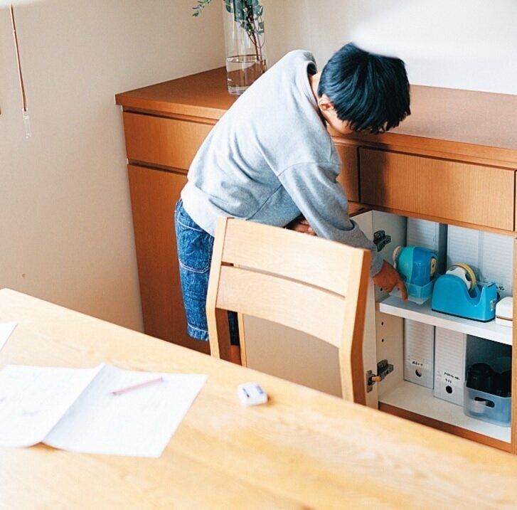 宿題の途中で夕飯の時間になったときは、やりかけの物はキャビネットの上に一時避難。「テーブルのすぐ近くの収納に空きスペースがあるだけで、忙しいときも慌てなくてすみます」。