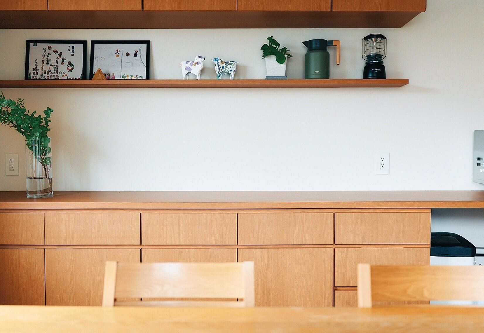 ダイニングテーブルは食事だけでなく、子どもたちの勉強や、仕事や作業する場所でもあります。だから、ここで使う物はすべてテーブルの近くが置き場所です。
