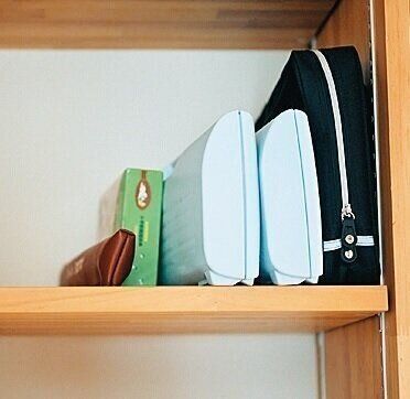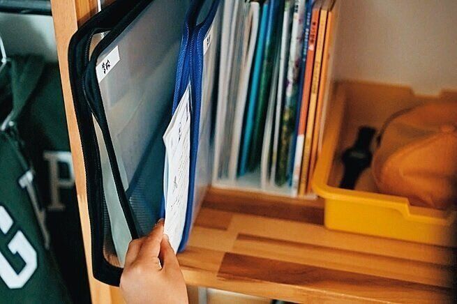終わったテストやプリントはセリアのファスナーケースへ。「学校用と習い事用の2つ用意し、子どもが自分で入れています。1学期でいっぱいになるので学期末に中身を処分」。