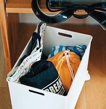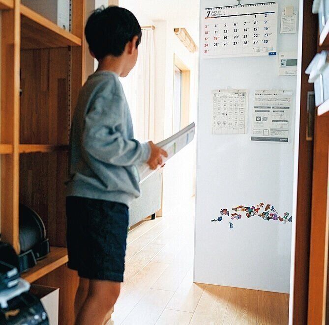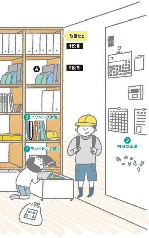 「ランドセルをそこら辺にポイ置きされないようにするには、どうしたらいいか?」と考えて思いついたのがこれ。帰宅して手を洗うまでに通る場所に、教室のランドセル置き場みたいに投げ込むスペースさえあれば、小1でもできます。