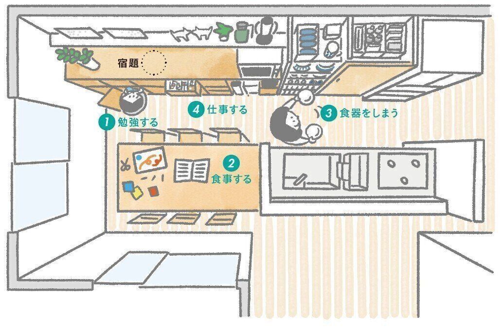 片づく家の秘密は使う場所に一極集中!ダイニングテーブルの近くには勉強や食事、仕事に使うものなどを集中させています。ランドセルや学用品だって1カ所にまとめれば散らからない◎。片づけがゼロになる工夫をご紹介します。