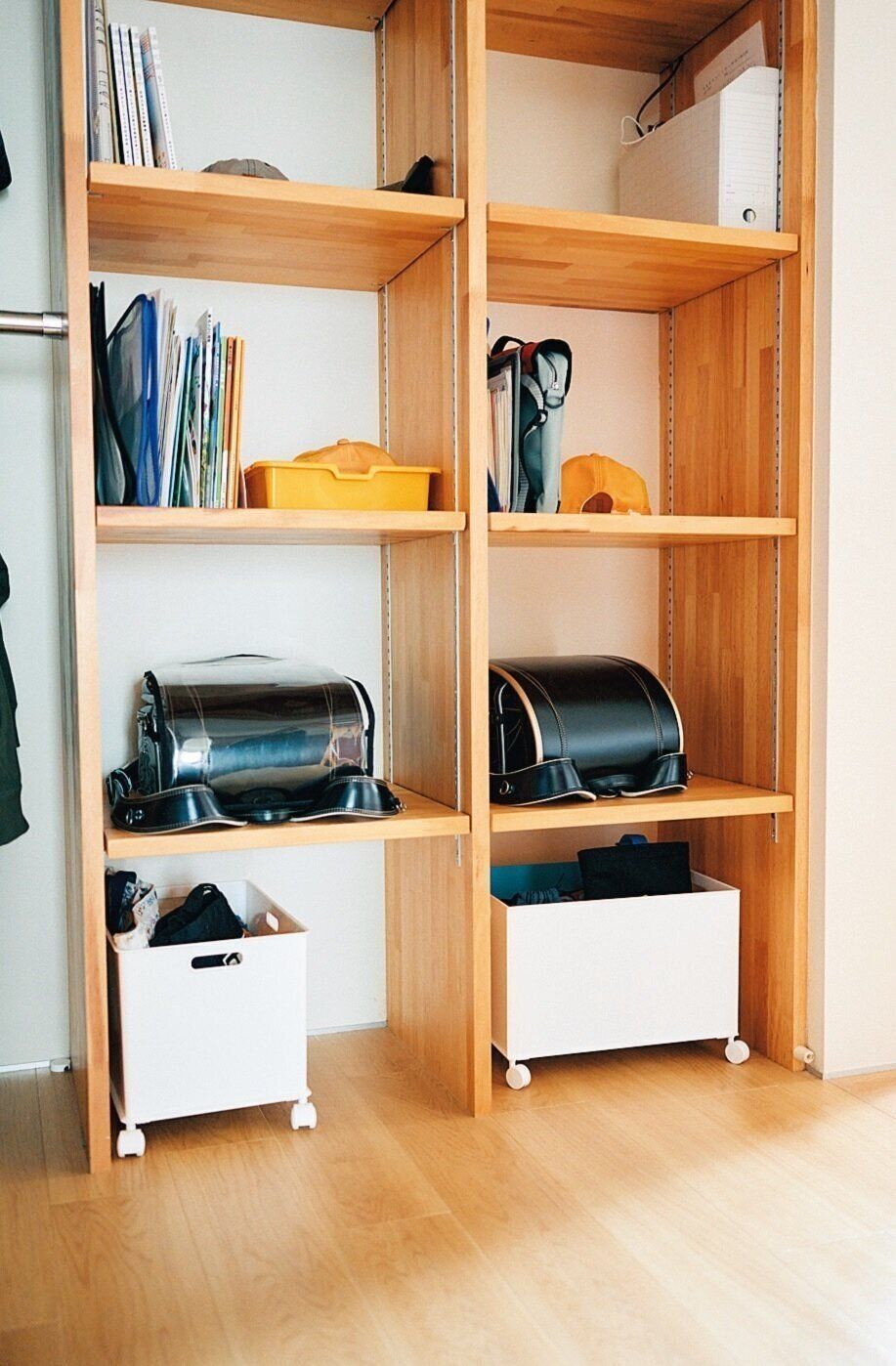 リビングの横にランドセル、教科書など学校で使う物を集中収納。帰ったら置いて、次の日はここから持っていけばいいだけなので出しっ放しも、探し物もなし!