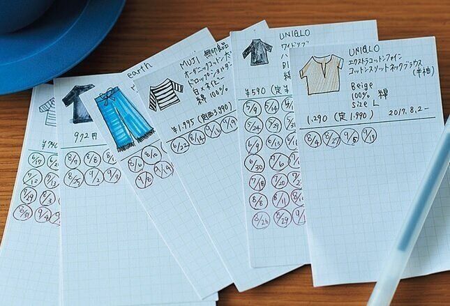 持っている服は1着ごとにカードに描き出し、素材や価格、着た回数を記録。こうすることで自分の好みが明確に。「飽きずに30回着られるか」自問することで、ムダ買いの防止にも役立ちます。