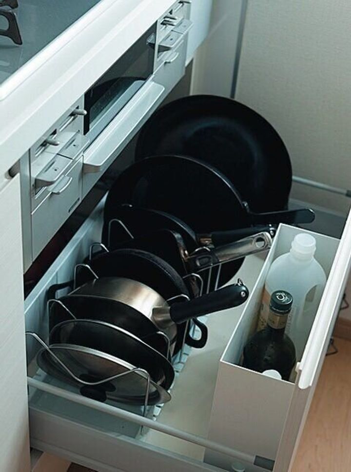 フライパンなどの調理器具は、重ねればたくさん収納できるけれど、下の物は取り出しにくくて結局、死蔵品に。数を少し減らして立てて収納するようにしたら、出し入れ時のストレスがなくなりました。