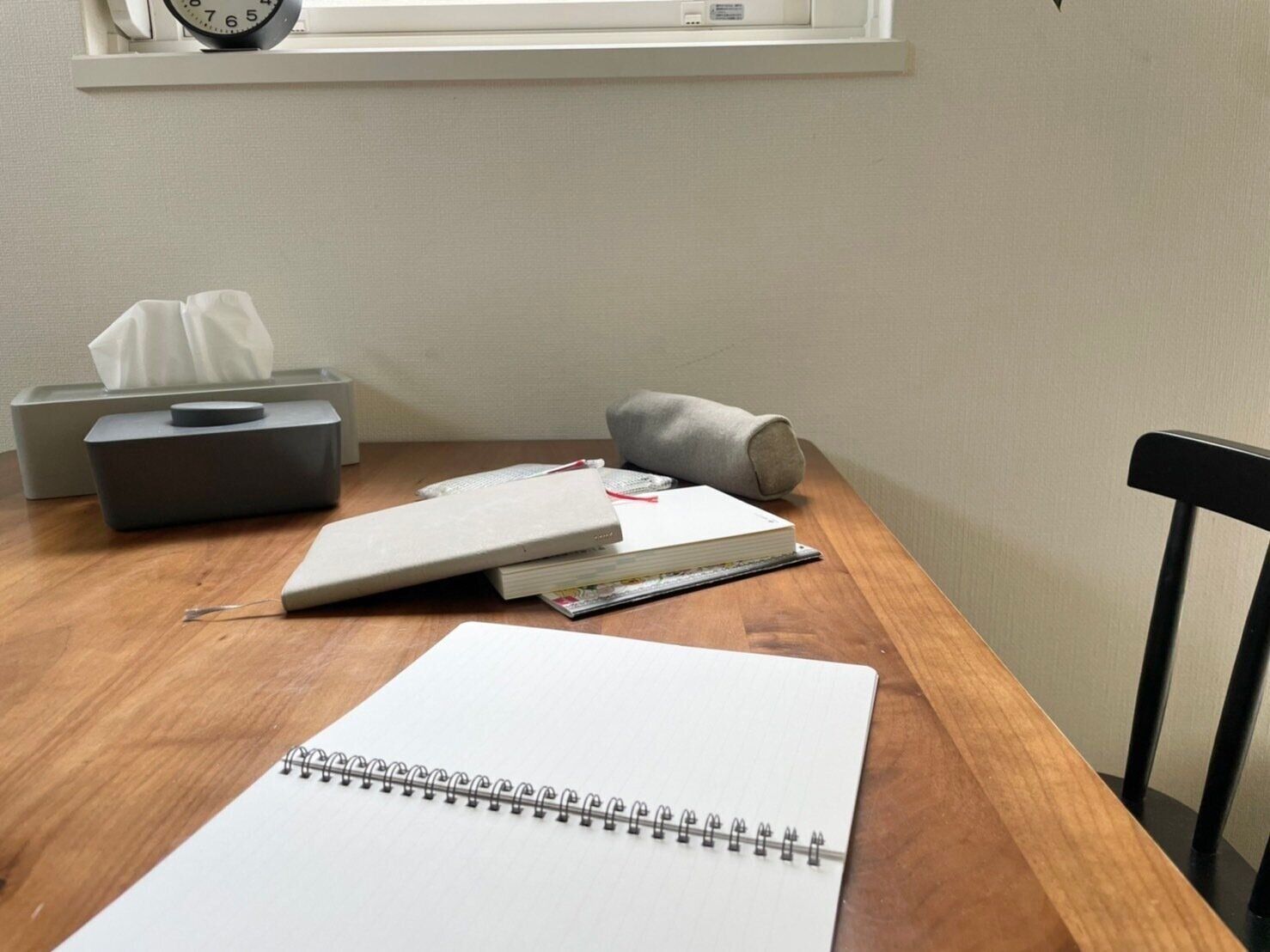 いろいろな作業をするダイニングテーブルには、文房具や家計簿などのノートなどが置かれがちです。ダイニングテーブルを壁にぴったりくっつけている配置の場合は、壁側にモノがより置きやすくなってしまいます。