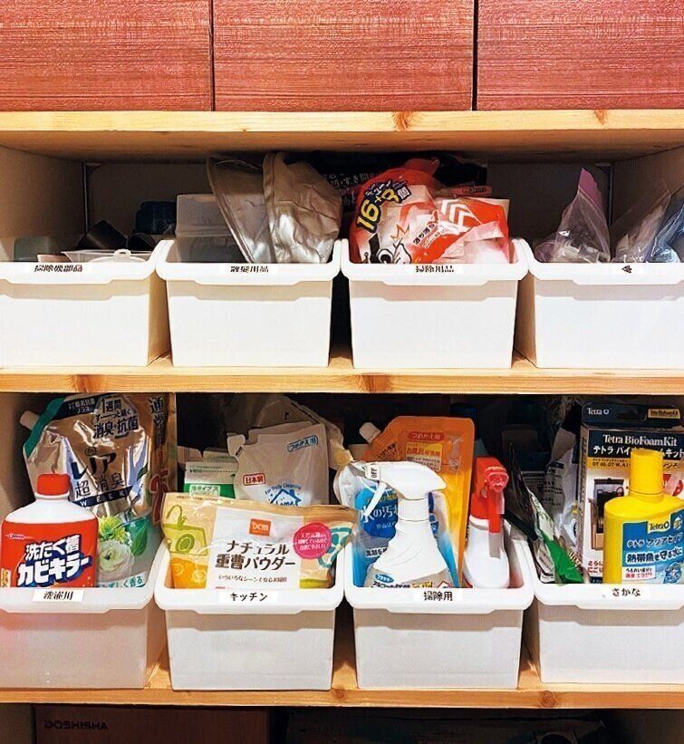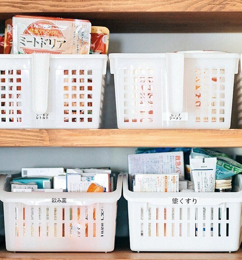 ラベルを堂々と貼ると、見た目はちょっとダサくなる……?!「見映えより使い勝手が大切だから気にしません。小4の長女でも『あれはどこ?』とは言わず、必要な物を自分で出しています」。