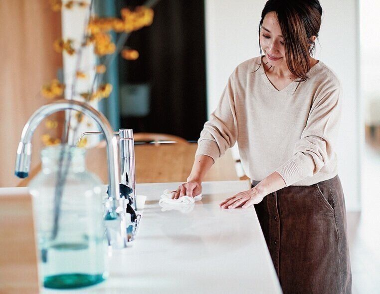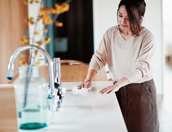 以前は洗面台の下が洗剤だらけだったことも。「でも、クレンザーと住まい用の洗剤、そしてメラミンスポンジがあれば、たいていの汚れは落ちます」。ストックをいろいろそろえる手間と出費もカット。