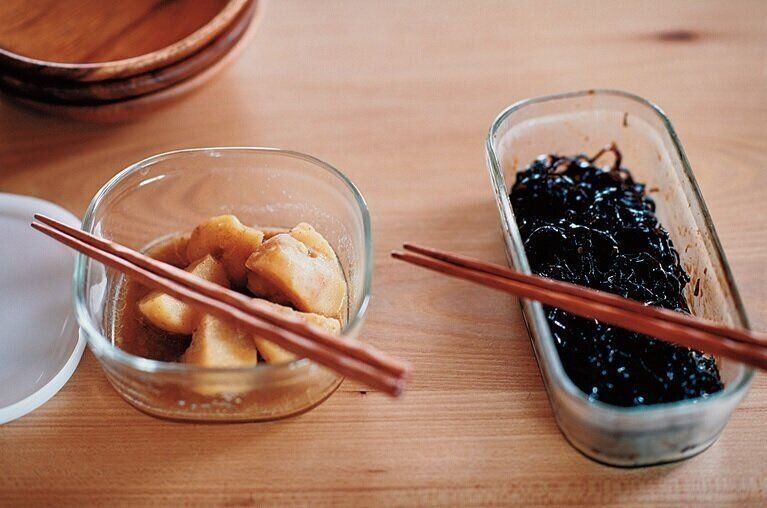作り置きのおかずや漬けものなどは、「イワキ」の保存容器に入れて、そのまま食卓へ。取り箸を添えれば、ふたをして冷蔵庫に戻せるので、人数分の小皿に取り分けたり、小皿を洗う手間が不要に。