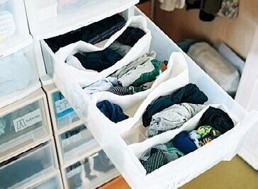 息子たちは3人一緒にお風呂に入るので、まとめて出せるようパジャマとパンツのみ3人分を同じ引き出しに。人別に不織布袋で仕切ってます。