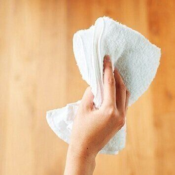 使い古しのタオルを八つ折りにし、折った部分がバラけないように親指と人さし指でタオルをホールド。「『コ』の字を描くようにジグザグに拭き、2回拭くと拭き残しを防げますよ」(飯田さん)。