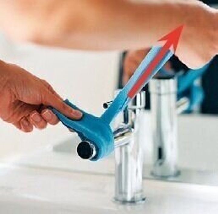 マイクロファイバータオルを折って蛇口に巻き、左右にキュッキュと動かすと洗剤なしでもじゅうぶんキレイに。タオルをクロスするのがポイントで、力が均等に行きわたり、磨き残しがない。最後にバーを拭いてフィニッシュ!