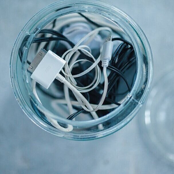 昔のパソコンのケーブルや携帯電話の充電器は、つい取っておきがち。ほこりはたまるし邪魔だし、なによりもう使いません。今後は、本体と付属品をまとめて破棄するルールに。