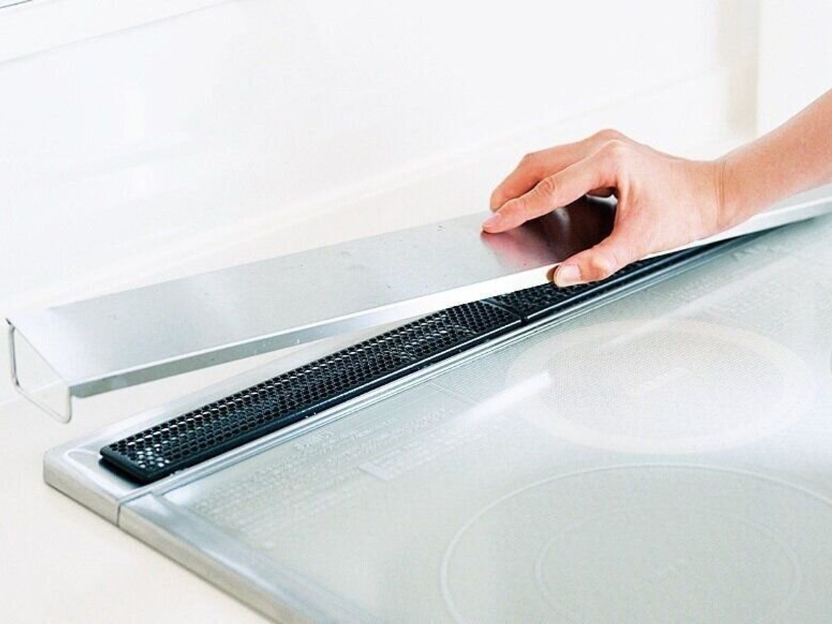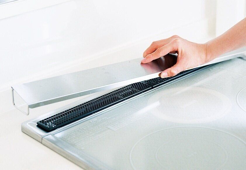 網目になっている排気口の掃除はズボラ主婦(夫)の敵です。これで調理中の油ハネを完全ガード。表面がフラットなので、サッと拭くだけで油汚れがスーッと取れます。