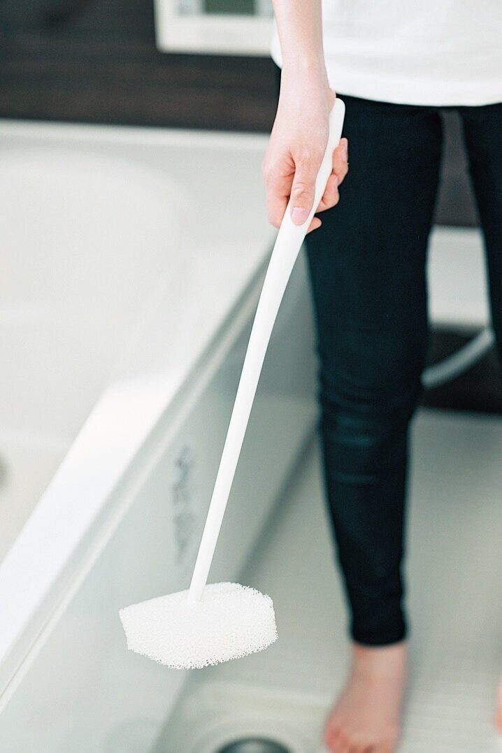 ズボラのお風呂掃除には柄付きスポンジがマスト。右手にスポンジ、左手にシャワーを持って、立ったまま床も浴槽も洗えます。使用後はブンブン3回振って水切り終了。