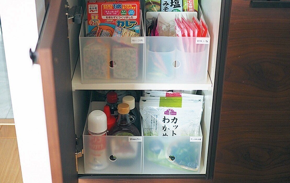 さまざまな物が混在する食品ストックは、家族全員から「よく見える」ことが重要。収納用のケースは半透明、深い物より浅い物を選ぶことで、扉を開けただけで全体が見渡せる。「料理やストック補充を家族に任せられます」。